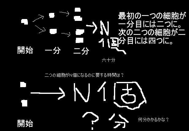 つっこまれた。本当だ。2個の細胞が「60個」になる・・・って書いてる。ハイ。答えの正誤うんぬんより先に問題が間違ってるね。うふふふふ♪さて、ここで再度問題です。前回のクイズ。間違ってたのはどこ?!間違っている箇所を考えてください。案外簡単です。 追記ヒント:ハンカチと思って持っていたものが、実は靴下でした。道理で臭いはずだ・・・