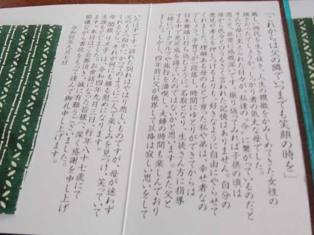 会者定離 この世で出会った者には、必ず別れる時が来る運命にあること。今年に入って従弟、茶道の先生、日本舞踊で長年活動を共に歩んできた先輩等突然の訃報が続いて心が沈んでいます(6月、8月、今月は6日、7日)先日会葬に参りました時の子供さんの会葬お礼状の書面です。それと長年ご活躍の場面を納めたアルバムも提示公開されておりました。故人、お母さまは息子さんの真心にさぞかし喜んでいられる事でしょう合掌