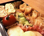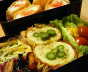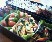 2日分のお弁当をUPします~ ハーブソルト味の卵焼き、フキの煮物、胡瓜と中華クラゲの和え物、 じゃが芋のチーズ焼き、自家製ミニ春巻き、プチトマト コーン天ぷら、竹輪の磯辺揚げ、ピーマンソテー、 自家製ミニハンバーグ、切り干し大根ポン酢和え、蕗と椎茸の自家製佃煮 ***************コアサの仕事がらみの知人からフキをたくさんいただきました。私、大好物なのでと~っても嬉しいんですが とにかく量がはんぱじゃない!アクを抜いたり、皮を剥いたり、水煮にしたり手はかかるけど大好きだから苦じゃなかったはずがいくらなんでも多すぎて、初めて嫌になりましたー はぁ~ お向かいさんにもあげました。好きかどうかわからないので適量に。お礼にと、掘り立てのタケノコを頂きました。うれ・・・ し・・・ い・・・ タケノコも好きです。だけどこりゃまた下ごしらえしなきゃじゃーん?煮えてるのが欲しかったです(こら) せっせと料理に使って食べてるんだけどなかなか減りません。お弁当にも入れてますが、なんかこれって高校生弁当って感じじゃないよなぁー