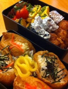 今日は牛が校外学習なんだって。で、久しぶりのお弁当作り。 栄専に進学してから猿にはお弁当を作ってなくてどっかで買うなり、おにぎりを作るなりなんなり、「自分でどうにかしなよー」 と考えさせてます。だってさー 今日は何限だから要らない だの 今日は早く行かなきゃならない だのいちいちそんなの覚えられねーーっつーの。それをちゃんと前もって言ってくれるならいいけど、朝になって言われてもイラつくっちゅーねん。で、そういうことになった。 そりゃあ私に作って欲しそうだけど、そういう当たり前も当たり前じゃないってこと。ちったー判れよ!って、崖から突き落すライオン母(父だっけか?)の深い愛。と言って、おにぎり向けの具材なんかをいろいろ買って冷蔵庫に入れてあるから中途半端なライオンなんだけど、それでもじわじわ効果を期待。ブーブー言いながらも寝る前に炊飯器のタイマーをセットするようになりました。あはははライオンと言うよりも、母がグータラだから自立するしかない? 「明日 牛がお弁当だから一緒に作ろうか?」と声をかけたら「え!マジで? やったー! お願いします^^ おかずになるような物、なんか買ってこようかなーー って思ってたとこだった^^」ふふふ確かに、、、何にもないからねーーー 冷蔵庫ン中(^_^;)月曜日から学校で、お昼のことはなんにも言わないからどうするのかと思ってたけどちゃんと考えてたのねーーー ふむふむ おいなりさん(紅ショウガ入り酢飯と炒りごま入り普通飯)、たくあん、、刻み海苔、紅ショウガ、 手羽元唐揚げ、カボチャフライ、プチトマト、カイワレ大根、さやいんげんソテーの卵焼き巻き、