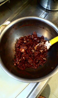 割りチョコ (ビター) 70グラムくらい(ハート用) 板チョコ一枚相当かな &120グラム(オマケ 無塩アーモンド・・好みの加減で砕いたもの と そのままの粒に わけるコーンフレーク(プレーン)・・テキトウにチョコがからまるくらいの限度量これらを使って,ボリュウムあるチョコをつくりました。チョコを一度に大量に食べるのを控え、食べごたえのある感じをだしてみました。まずは・・チョコだけを湯せんにかけます チョコが溶けたら たっぷりコーンフレークをばりばり入れてしまおう。お玉2杯弱分かな・・これまた おおざっぱ。そして 大雑把に砕いたアーモンドをいれて 全体をまぜまぜ~次に・・入れ物へ入れよう。 百円ショップでかいました。今後はちらし寿司,チキンライス,プリン,ゼリーの型としても使う予定。*型のそばにあるのは、『たこやき』器で娘たちが作ったチョコ入りベビーカステラです。 <ちょっと脱線>これは煎餅です。。。義父へプレゼントしたサンプル 娘たちと違って、私はラッピング材料は家にあるもので省略~父さんに 初めて手作りチョコをあげました。子供達は,おおきいハートチョコをかぶりつきたそうに父さんがかじるのを、そばで見ていました。今年はオレンジピールチョコに挑戦したいので無農薬のハッサク,甘夏あたりをさがしたいです。さてオマケ、明日から,ちょこちょこっと食べるチョコ達です 以下