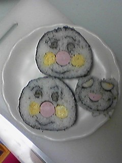 節分ということで 巻き寿司に挑戦したみました。それも 初めてだというのに 飾り巻き寿司 という物をしてしまいました。かなり 無謀な挑戦でした。インターネットで調べて見つけた カエル巻きとアンパンマン巻き。父と母は 悪戦苦闘でした。父が カエル巻き担当で 母は アンパンマン巻き担当。初めてにしては 上手に出来ました。コロちゃんは 始めは喜んでくれたんだけど...全然 食べてくれず...口や鼻 ほっぺなどに使ってあるソーセージや卵ばかり 食べてました。苦労して作っても 子供ってこんなもんよね~~。