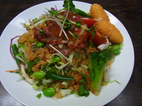 本日の昼飯代 これのみ480円なり!本日はうどんの日なのであります。ちょうど 昼ときは 仕事で行けませんでしたが、三越前ではうどんが ふるまわれたのでは ないでしょうか?ちょいと 気を抜くと 『野菜摂取不足な おじさん』に すぐ戻ってしまう拙者まえまえから チェックしとった 枡屋さんの サラダうどん 行ってみました。これが また うまぁぁぁ! 高雄さんの サラダうどんとは また 違った 面持ちっす!基本 ポン酢味ですが、鶏肉のとこには ポン酢ジュレが・・・そして 可愛い 円錐形のフライは ハッシュどポテトのフライ?かな、じゃがいもの味っす!トマト、レタス、かいわれ、いんげん、ブロッコリ、しめじ、?豆、キャベツ・・・あれれ 8種類??次回は 真剣に 10種 数えながら 食べまっす!枡屋さんの 当然ながら 太い系の 麺は むっちゃ 美味しく 拙者の ストライクど真ん中ですランキング応援お願いします!ワンクリックお願いします