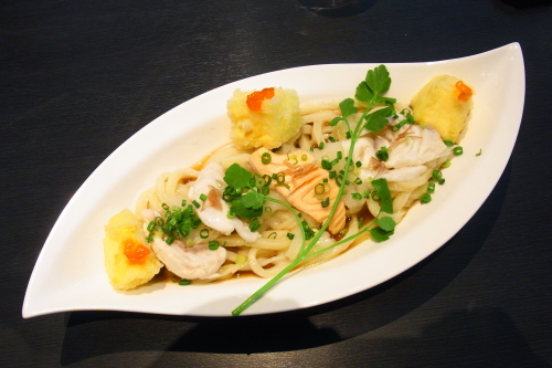 本日の昼飯代 これのみ800円のとこクイズに正解して 100円引きで 700円なり!大将の たくちんの美的センス炸裂の 超絶 美しい ぶっかけうどんなり!本日は 水曜日、そして 水スペは・・・新しい 趣向っす! クイズうどん・・・ クイズに正解すると 100円引きこりゃぁ 真剣に考えっどぉ!『この うどんに使われてる 食材は なんでしょう?』ってクイズで、水スペメンバーは 必死に ちょこっとずつ 食べながら 悩みました!つるポン系の 冷たい ぶっかけ、 オレンジ色の うに味のキクラゲが載った たまご豆腐の天ぷら鯛、鮭、七草のひとつ せりが トッピングされた 美しい おうどんっす!ぶっかけつゆが、酸っぱいながらも 果実系の甘いとこに気が付き、クイズの正解は 『りんご』でした。りんごと 大根おろしで絶妙の ぶっかけだしを作ったとのことです。 すっげ懐かしい写真はこちらランキング応援お願いします!ワンクリックお願いします