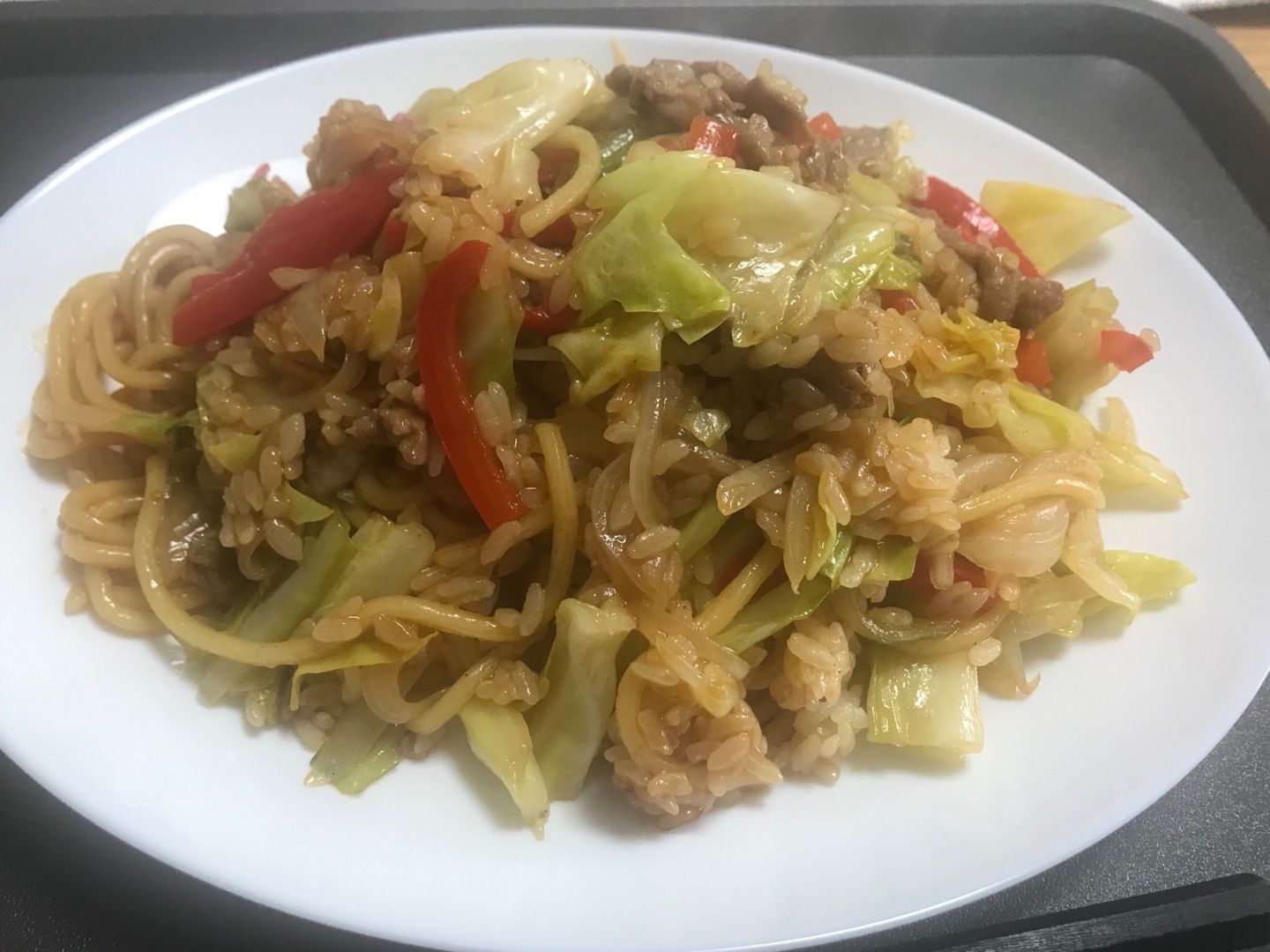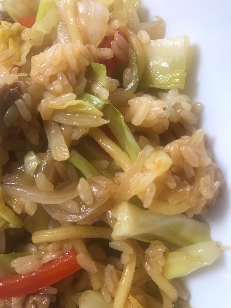 冷蔵庫の 残りごはんと 野菜適当に ちゃちゃと 炒めて 完成!