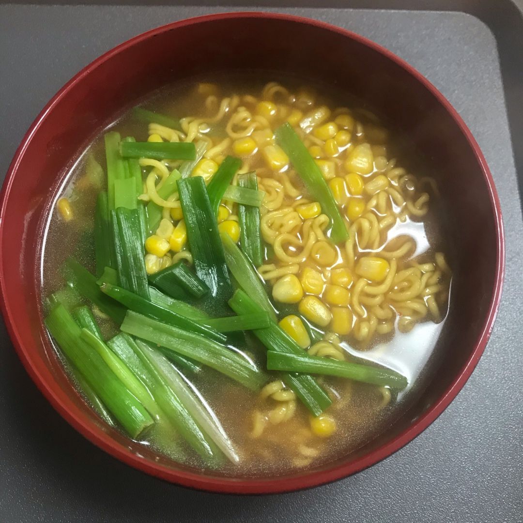 本日の昼飯代、5袋入りの1袋で64円と 冷蔵庫のねぎとコーンで約72円???