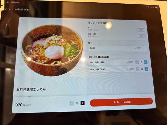 本日の昼飯代はお月見味噌きしめん970円に焼き餅トッピング160円で