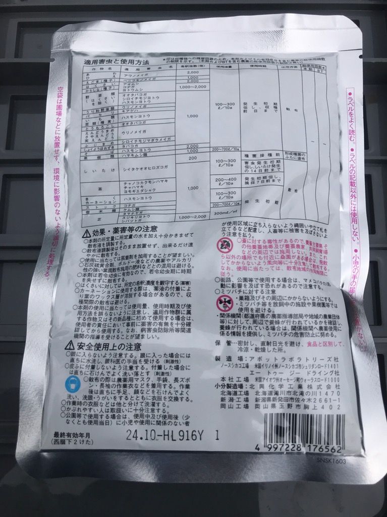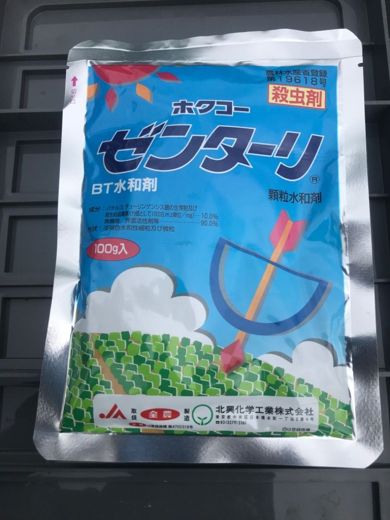 ゼンターリ顆粒水和剤というBT剤が比較的安全で良いとことでしたので購入して薬剤散布してみました。