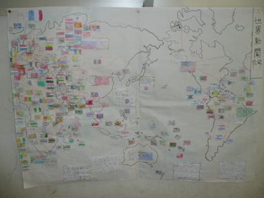 今日は役員の用事で学校に行ってきました。ついでに、(というか、こっちの方がメインかも)長男のクラスの学級新聞を見に行きました。これは、クラスで6人位ののグループに分け、それぞれがテーマを決めて力を合わせて1つの新聞にまとめ上げる、というものです。2学期の学習だったので、もちろんみんな2学期中に仕上げています。(学校の池の由来や歴代校長先生の名前、給食が出来るまで・・・等など、様々な新聞がありました。)しかし、長男のグループだけが2学期終了に間に合いませんでした。何故かと言うと、世界地図&全世界の国旗を紹介する、というテーマで203ヶ国の国旗の記入が間に合わなかったのです。担任の先生も「がんばっているから仕上がりを待ちます。」と言ってくれていました。そして、ようやく出来上がり、廊下に張り出されていたので、楽しみにしていました。一番大変だったヨーロッパ国旗のデザインの由来も紹介していますこれはみんなで書き込んだのではなく、それぞれが家でたくさん書いてきた小さい旗の集合なのです。1つがこのサイズです。本当によくがんばったと思います。今年度が終わってもずっと掲示してほしいです。