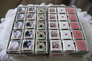 皆様、こんばんは~昨日からの カウプレ のご参加ありがとうございます。まだの方も、是非参加してくださいね~ さてさて。昨日、心待ちしにていたものが届きました ずらり~~~~~~~~~んっ これは何かと言いますと、最近話題の、「 DECOチョコ 」です~サイトから、自分でカスタマイズした、オリジナル包装のチロルチョコが注文できるんですよ~ こんなカンジで出来上がります♪ 私は、 我が子たちの写真と、自分で描いたマルや、大のお気に入りの、ENOさん が描いてくださったイラストで注文しました。(ENOさん、イラストの使用をご快諾くださってありがとう~~^^) 先日、TVで紹介されたみたいで、現在は注文してから1ヶ月近くかかるみたいですが、お値段もお手頃で楽しいですよ~