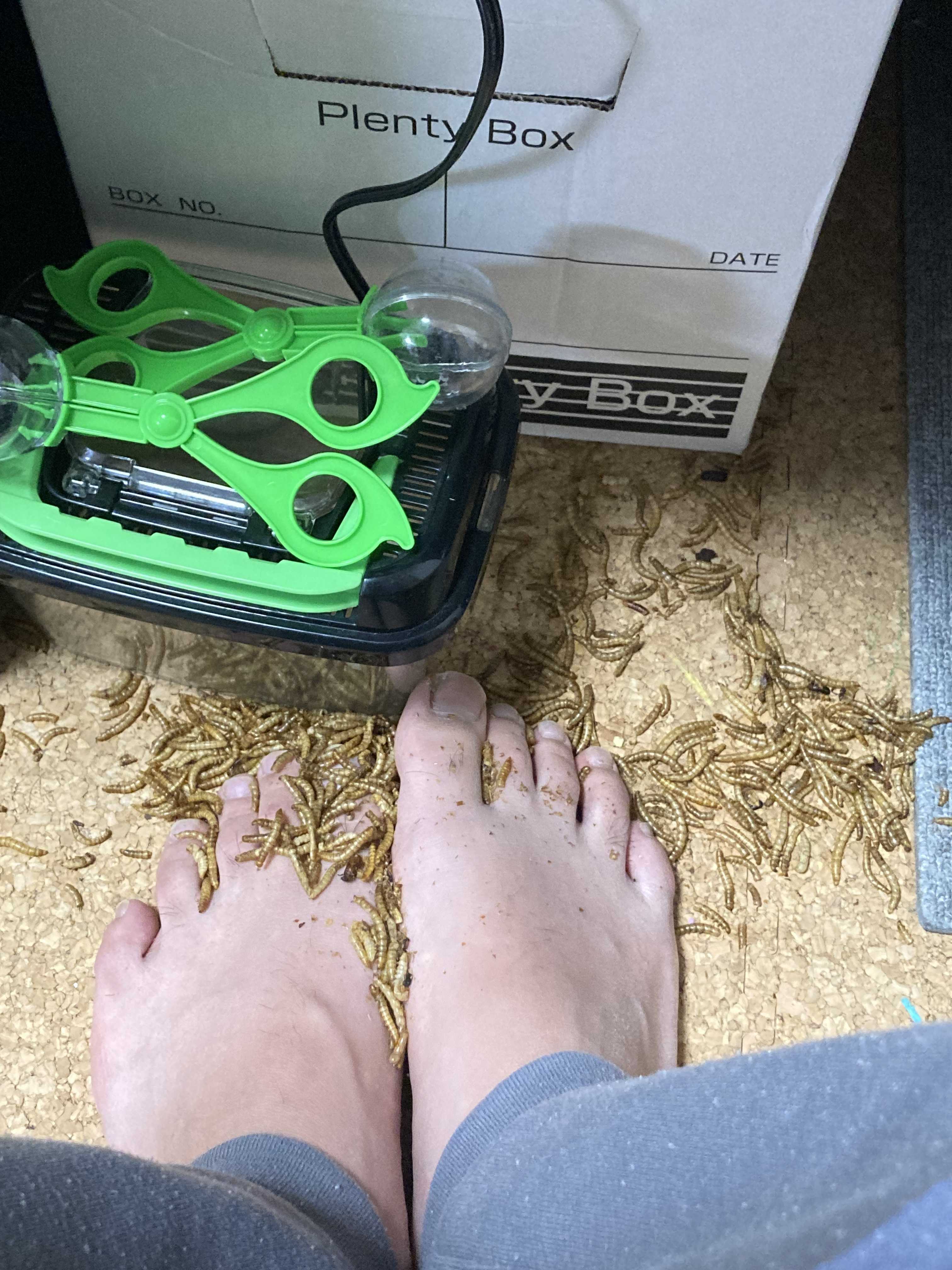 やらかしました。おやつのミルワームをあげようと思ったら、、、めっちゃ気持ち悪い笑人工餌は量が多い分落とした時のダメージでかいので気をつけましょう笑