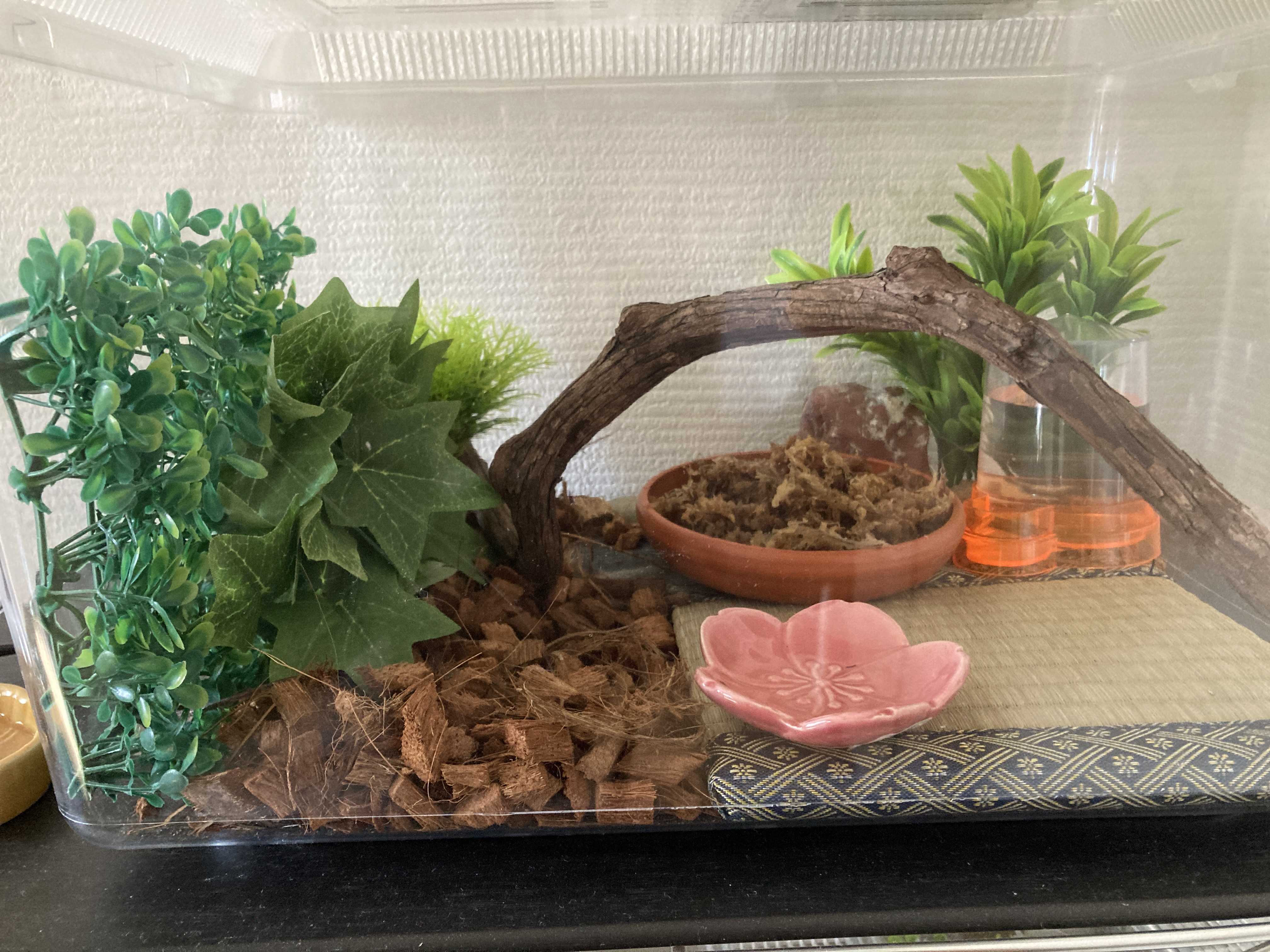 乾燥ミルワームはだいぶ慣れた様子で各々食べたい時に食べるようになりました。カナ太郎ととうふが食べに来ているのを見るとニヤニヤが止まらないー。そういえばとうふの動きが少し緩慢でカナ太郎に捕まったり逃げない事が増えた気がするー。もう少しなのかなー。