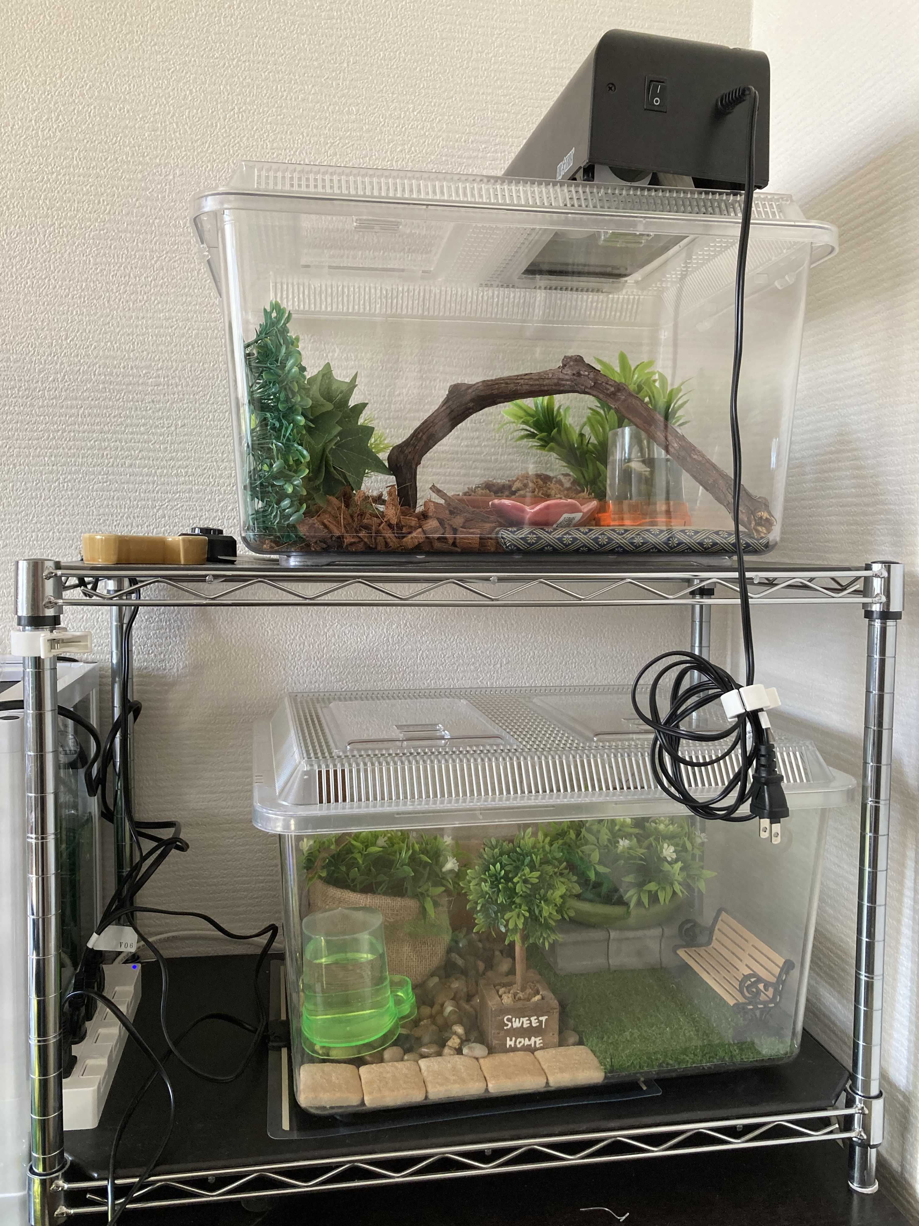いよいよ今日からお出かけです。結局こんな感じで1匹ずつ隔離にしました。各ゲージにしたこと。・隠れる場所があるようレイアウト・水飲み場の設置(1週間余裕なくらい)・水苔の設置・パネルヒーターor暖突で保温・タオルで保温と暗くする・出発前にご飯。・保存食としてカルシウムまぶした乾燥ミルワームを多めに設置。出来る事はした!!と思う。これで乗り切る。めっちゃ不安だー。まだ朝も早いので顔も見れなかったけど...来週また会おうね!カナ太郎!とうふ!どて煮!いってきます!