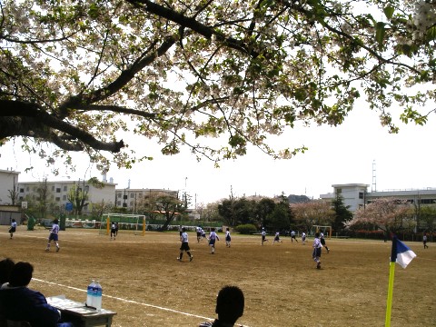 18切符が余っていたので、怪しいおじさんは駒場の前に久里浜小に出現(笑) 横須賀市サッカー協会大会高学年の部。U-12追浜が出場。会場の久里浜小は桜が散りだした頃。何か風情があってよろし。■城北ファイターズ21 0-6 シーガルズA例によって貧乏性なもんで、1試合だけじゃもったいないと思い、ちょっと早めに到着。JY追浜の小野君兄弟の出身チームである城北ファイターズに注目(21ついてるけど、同じチームだよね?) が、試合は終始シーガルズ優位な展開。スコアどおりの試合だった。■横浜U-12追浜 1-0 大津A続いて追浜U-12。初めて見るチームだけど、よく声がでるチームなのでありがたい(笑) ほとんどの時間ゲームを支配していたのは追浜だった。が、大津も守備がよく、なかなか決定的なチャンスを作らせてくれない。ゲームが動いたのは前半16分。浮き球を高梨君がジャンピングボレー。きれいなゴールだった。大津も、うまくDFラインの裏に抜け出し、GKと1-1のビックチャンスがあったが、中島君が素晴らしい対応を見せた。追浜は無失点で前半を終える。後半。追浜は的早君を下げ、大手君を投入。大手君はFWに入り、FWの栗原君がGKに。GKの中島君は左サイドに入り(8)、高梨君がトップ下。後半も同じような展開。前半よりは追浜にチャンスが多いが、大津も集中力を切らさず、結局スコアは動かず。今日はもう2試合あったが、トップの試合と重なるので泣く泣く久里浜小を後に。_栗原(11)___伊東(19)______的早(22)_____高梨(21)_______斉藤(9)___林(18)_若林(20)___小松(3)__伊池(4)__太田(2)_____中島(1)_____得点: 前半16分 高梨交代: HT 的早→大手(17)