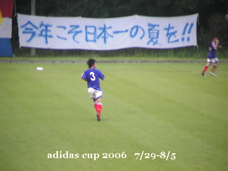 引き続き第2試合。横浜の初戦の相手は大分。U.S.鹿児島支局のIさん情報によると、なかなか侮れないチームという話。それに、あまりいい思い出のない(らしい)ピッチ1での初戦。確かに去年の初戦の三菱養和戦は何度も秋元の神がかりに救われた。それが無ければ、正直ヤバイ試合だった。今回も中々難しい試合になるのではないかと予想。しかし、去年までと大きく違う事が。それは、サポとダンマクの異常なまでの多さ。ピッチ1のゴール裏は所狭しとダンマクが張られている。「生まれながらのトリコロール」ダンマクもその誕生のきっかけの地に(正確にはスタジアムだけど)、初めて張られた。あれから、1年近くたったんだと改めて感慨。サポも、去年対比10倍くらいはいるだろうか。試合後の話だが、札幌サポが「何でマリノスはこんなにサポ多いんですか?」とビックリしていた。とりあえず、「バカばっかりなんです」と答えてはおいた(笑)応援は十分足りていたので(というか、人が多くて見れるスペースがなかった)、今回は土手上で推理ゲーム&記録係を。といっても、もっぱら試合を楽しむのに徹する。いや、楽しまずにはいられない試合だった。立ち上がりは、一進一退の展開。均衡が破れたのは前半28分。水沼が思い切って打ったミドルを、ゴール前で山岸がワンタッチでうまくコースを変え先制(したらしい。遠くてよく判らなかった)。とはいうものの、あまり出来はよくはなく、なかなか苦しい展開になりそうな雰囲気はぷんぷん。しかし、後半、リズムに乗った横浜が完全にゲームの主導権を握る。今日のJヴィレは涼しく、風はちょっと冷気を帯びているほど。ピッチ上も同じかどうかは判らないが、横浜の選手の運動量は圧巻。特に両サイドバックの武田、幸田の運動量が素晴らしい。Gさん曰く、「幸田には奈良輪がのり移っている」 確かに。サイドを何度も駆け上がり、チャンスがあるとみるや、どんどん中央にも切れ込んでくる。あまりの運動量に賞賛はいつの間にか、「幸田、おかしいよ」というよく判らない絶賛に変わる(笑) 武田も負けていない。左サイドを駆け上がり放たれるクロスは、得点の匂いがする。学が飛び込んで、あわやという瞬間をはじめ、何度もチャンスを作りだしていた。そして、今日の試合で最も輝いていたのは水沼。1点目につながるシュートをはじめ、何本も果敢にシュートを放つ。ボールを持つとまずシュートを考えている。大きく外れることもあるが、失敗しても笑顔を絶やさない。まるでロナウジーニョみたいだ。水沼宏太はサッカーの神様に愛された選手ではないか、とそんな大げさな事を書いてしまいたくなる。そして、そして、今日一番うれしかったのは、我らの11番、木村のゴール。武田からのパスを受け、ドリブルで持ち込みつつ、うまくキーパーのニアを抜いた。そうそう、学や水沼の活躍はうれしいけれど、やっぱり3年生ストラーカーが最後の夏に輝かなきゃ。このゴールが木村伝説の幕開けになって欲しい。結局終わってみると5-0の圧勝。正直大分相手にこれほどの大差になるとは思わなかったので、これで選手が油断しないかと、勝てば勝ったで心配な親心(笑)______木村(11)______水沼(12)__森谷(8)____学(24)___アーリア(10)_山岸(5)___ 武田(2)_田代(3)_広田(4)_幸田(6)_______佐藤(16)______得点: 前半28分 山岸 後半10分 水沼 後半12分 木村 後半36分 水沼 後半39分 アーリア交代: 後半15分 森谷→金井(13) 後半29分 木村→大久保(7) 後半31分 学→端戸(25) 後半39分 広田→甲斐(34)試合後は、あちらこちらをつまみ食い。勝った後に、よそのチームの試合を見て、無責任にプレイについてあれこれ言えるのもJヴィレならではの楽しみ。前半は関西の大会でガンバに3連勝した神戸vs名古屋を。試合は退屈なものだったが、神戸サポの”ケイタソガベ”コールは必聴。今年のJヴィレチャント大賞大本命(笑) 後半は移動するのが面倒だったので引き続き神戸vs名古屋。しかし、やっぱり退屈。なので重い腰を上げ、ピッチ3の東京ダービー、読売vs養和へ。この試合は、一人少ない養和が読売に2-0から追いつきドローという試合だった。追いつくところは見られなかったけれど、勝ち越し点を奪いたい読売の攻撃を養和が必死で食い止めるのは手に汗握る展開だった。ちょっとしか見れなかったけど、明らかに3試合目のベストバウト。てな訳で、初日から100%Jヴィレを堪能し、夜は夜で楽しいお酒。更新が遅れるのも無理はないと、皆さん暖かい目で(笑)