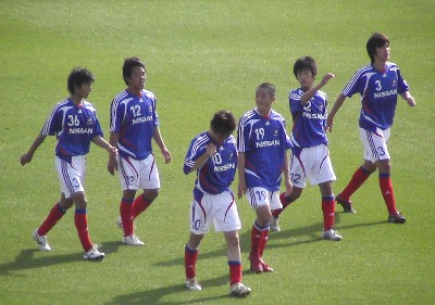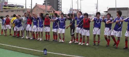 プリンスリーグ第6戦。育英グラウンドでの前橋育英戦。春先の育英フェスでの対戦に続き、今年2回目の対戦。ちなみに、育英フェスの時は小野、榎本の得点でリードするも、後半2点を返され引分だった。今日の横浜は前節読売ユース戦とほぼ同じメンバーながら、奥山が風邪(?)で欠場。奥山はかなり怪しげな格好で会場に姿を見せていたが、どんな格好だったかは現場にいたサポだけの秘密ということにしておこう(笑) 奥山の代わりには成田が出場し、甲斐、成田のCB。前節負傷退場した金井も、普通に先発。ほっ。開始早々、学のパスを受けた高久のゆるいシュート(※)を育英GKは見送る。ああ、外れたかと思っていたら、ボールは”ころころ”という感じでゴールに収まった。あまりに意外なゴールに思わず笑いが起こる。2007/05/15※高久のシュートがDFにあたり、それをGKが見送ったというのが正しいようです。前半ポゼッションは横浜・・・と、いつものようにゲームの流れを書こうとしても、なかなかイメージが形にならない。今年のチームは、選手個々は皆頑張っていて、いいプレイもあるものの、どうも心が沸き立つような”流れ”が感じられない。記憶に残るイメージがない。まぁ、それは見てる方のわがままというものか。前半22分には水沼のゴールで2-0。後半は追加点が奪えず、そのうち前育に流れが傾き何度もピンチを迎えた。佐藤のナイスセーブ連発がなければ、逆転負けしてもおかしくない展開だった。それでも、キャプテンがブログで書いていたように、暑い中しっかり耐えて、今年のプリンス初の完封勝利。そこは大いに評価したい。選手達としてはそちらの方が大きいかもしれない。試合後の笑顔がそれを語っているような気がする。(写真:おお~~、おい!はタイミング合わず、やり直し:)_______齋藤学(10)__端戸仁(14)______高久朋輝(8)_______________水沼宏太(9)______荒井翔太(19)__西脇寛人(6)______岡直樹(36)_甲斐公博(13)_成田進太郎(3)_金井貢史(7)__________佐藤峻(16)___________得点: 前半03分 高久朋輝(8) 前半22分 水沼宏太(9)交代: 後半26分 高久朋輝(8)→出口将司(11) 後半35分 端戸仁(14)→曽我敬紀(15) 後半41分 荒井翔太(19)→佐藤優平(18) 後半41分 岡直樹(36)→中島ファランパリス(2)
