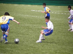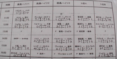 話は昨日の15:34(推定)に遡る。プレミアカップ準決勝のガンバvs名古屋を一緒に観戦していた仙台サポ兼ライターのKさんと翌日の日程など話していたところ、Kさんは鹿島にアイビーフェス(U-13の大会)を見に行くという。Kさんが持っていた日程表を見せてもらうと、新子安と追浜の試合がちょうど交互に2試合づつ行われる。しかも仙台、神戸、清水と普段なかなか見れない関東圏外のチームとの対戦。これは行くしかない。急遽いわきにもう1泊し、今日早朝からKさんと鹿島に向かって出発した。 ブーン⊂二二(^ω^)二二つ (C)Kギャル鹿島ハイツに到着。ちょっと迷ってグランド到着。■追浜U-13vs仙台立ち上がりは互角の戦い。先制は3分に仙台。GKが微妙に届かない高さのミドルシュートを決められてしまった。追浜が同点に追いついたのは思わぬプレーから。仙台GKがPA外で思わずボールをキャッチ。グランドには本来のライン以外のラインが薄く残っており、ちょっと混乱してしまったのだろう。戸惑う仙台GKはリスタートに備えることもせず、高い位置に立ったままだった。伊東君は、それを見逃さなかった。素早くループシュート。ゴール。仙台のキックで試合が再開。すぐにボールを奪った追浜。GKが高い位置にいることを見て取った米田君は、ロングループ。これがきれいに決まり、あっという間に逆転。同点からわずか1分の出来事だった。仙台GK君はちょっとショックかもしれないが、長い人生こういうこともあるさ(励)リードして気持ちに余裕のできた追浜、あせりの出た仙台。ボールを自由に回せるようになった追浜は20分に米田君のスルーパスに反応した伊東君がDFを振り切ってゴール。25分には米田君がまたしても長めのループシュートを決め追加点。今日の米田君は攻守ともにすばらしい出来だった。後半も追浜ペースで試合は進む。追浜は前半と前目の選手の左右を入れ替えるなどお試しモード。得点は19分の伊東君の角度のないところからのゴールのみ。 ______伊東海征(5)__栗原奨吾(8)______米田仁志(22)_____________戸邊凱也(15)_____村原大輝(21)___田中智也(14)_____秋月涼介(2)_伊池翼(3)_栗林健太(7)_中島大貴(17)_________入澤遼平(1)__________交代: HT 伊池翼(3)→太田勇樹(6)得点: 前半03分 (仙台) 前半11分 伊東海征(5) 前半11分 米田仁志(22) 前半20分 伊東海征(5) 前半25分 米田仁志(22) 後半19分 伊東海征(5)■新子安U-13vs神戸この大会は25-10-25で試合が行われ、各試合が1時間おきに開始なので、試合が終わるとすぐに次の試合が始まる。第2試合以降はグランド2で行われた。1試合目が行われたグランド1は段差のある観客席があるが、グランド2はベンチはあるものの段差がないので観戦するにはどうしても立ったほうがいい。また、太い金属性のネットにピッチが覆われているので、グランド1に比べて見づらいし、写真も撮りにくい。会場が逆だったら良かったのだが・・・新子安は神戸と対戦。キックオフ直後、両チームから声が上がった。 新子安サイドからは、「前から前から」 神戸サイドからは、「シンプルに」その言葉の通り、新子安は前へ前へと積極的に攻撃を仕掛ける。前への意識が高いのはいいのだが、簡単につなげばいいところでも強引に突破を図り、相手DFに囲まれボールを失ってカウンターを受ける場面が多い。一方の神戸は、寄せられる前に少ないタッチでシンプルにボールをつなぐ。攻守の切り替えも早い。チーム戦術が徹底しており、ボールを奪ってからシュートに行くまでが早い。この試合を見る限りでは、パスの正確さ、連動性、チーム戦術の徹底、いづれにおいても神戸が上だった。個の力も新子安に引けを取らない。神戸U-13はいいライバルになるだろう。後半、がらりとメンバーを変えた新子安だが、終了間際に野路君のドリブル突破で何度かチャンスを作れたものの、ゴールを奪うには至らず。今日のところは、神戸に完敗だった。今は個々の選手の特徴を見極め、最善の組み合わせを見出すときだから、結果にはこだわらなくてもいいだろう。しかし、新子安の選手は今日の敗戦を糧にして、次に神戸と対戦する時には勝利を奪って欲しい。<前半>___________野路貴之(13)__________持田里久也(21)____松井優斗(18)____河合力也(6)_______林亮祐(14)__船谷和史(17)______冨沢右京(12)_松崎颯介(19)_原田慎司(15)_田中秀明(10)___________佐山辰哉(16)__________<後半>_________宇佐見康介(5)__________河合力也(6)_渡辺悠貴(23)_相場遼介(2)_野路貴之(13)__________喜田拓也(7)___________高野遼(8)__松崎颯介(19)_諸石健太(22)_相原晃貴(3)__________佐山辰哉(16)__________得点: 前半24分 (神戸) 後半03分 (神戸) 後半24分 (神戸)