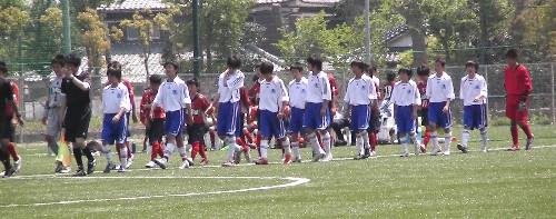 ■追浜U-13vs鹿島ノルテ5月初旬ともなると結構日差しが強い。グランドの周りには屋根などという気の利いたものはないので、周辺の木陰で見るか、日差しを我慢するかのどちらか。ちゃんと見たかったので、日のあたる金網にへばりついて見ていた。暑い上に、連日のハードワーク(笑)が堪え、何だか漫然と目の前でボールが行き交っているのを眺めていただけだった。かすかな記憶をたどると・・・・鹿島は小柄な選手が多かった。・ポゼッションは追浜だったが、あまり効果的な攻撃には結びつかなかった。・先制点となる林君のミドルループはきれいだった。・最終ラインの小松君が効いてた。・追浜の失点はカウンターから。北村君が思い切って前にでるがかわされた。待たせたあげくこんなレポですみませんm○m(写真:追浜U-13vs鹿島ノルテ 入場)______杉山雄大(12)__篠田朋宏(11)______高梨祐太(13)______________斉藤一磨(10)_______林拓弥(19)__伊池翼(3)_______飯田洋介(4)_小松勇樹(9)_太田勇樹(6)_前田啓介(20)__________北村征也(16)__________得点: 前半11分 林拓弥(19) 前半23分 (鹿島ノルテ)交代: 後半17分 篠田朋宏(11)、高梨祐太(13)→伊東海征(5)、田中智也(14)■新子安U-13vs清水この試合のフィールドプレイヤー10人のうち8人はプライマリー新子安出身者。一緒にやってきた時間が長いだけに、さすがに神戸戦よりはスムーズな連携がとれていた。最後尾からは、ピッチに活を入れるかのようにGK境君の声が響く。しかし先制は9分に清水。新子安も15分に宇佐見君のゴールで追いつく。これは実にビューティフルなミドルシュートだった。あそこから打つとは思ってもみなかったので一瞬何が起こったのかわからなかった。思わず、すげーと声を出してしまった。近くの父兄からも賞賛の声。エースの得点で勢いづくかと思われたが、20分、21分に連続失点。後半、メンバーを入れ替えた新子安。一進一退の展開ながら、14分にエース宇佐見がまたしても相原君のCKをどんぴしゃヘッド。17分には喜田君のスルーパスに抜け出した河合君が落ち着いて決めた。よく2点差を追いついた。試合はこのまま終了。ふぅ。ほとんど休みなしの4試合観戦は厳しかった。立て続けに見ると、1試合1試合の印象が薄くなっていけない。(写真:新子安U-13vs清水 試合終了)<前半>_____持田里久也(21)__宇佐見康介(5)_____渡辺悠貴(23)______________高溝黎磨(9)_______林亮祐(14)__喜田拓也(7)______高野遼(8)_原田慎司(15)_諸石健太(22)_田中秀明(10)__________境龍登(1)___________<後半>_______河合力也(6)__宇佐見康介(5)_____松井優斗(18)_______________高溝黎磨(9)_______船谷和史(17)__喜田拓也(7)______冨沢右京(12)_松崎颯介(19)_諸石健太(22)_相原晃貴(3)____________境龍登(1)__________得点: 前半09分 (清水) 前半15分 宇佐見康介(5) 前半20分 (清水) 前半21分 (清水) 後半14分 宇佐見康介(5) 後半17分 河合力也(6)交代: フォーメーション参照
