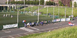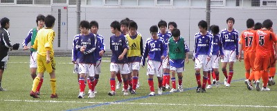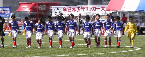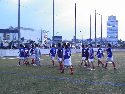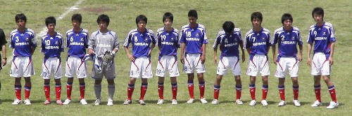 朝一のフライトで東京に戻り、そのまま神奈川県少年サッカー大会準々決勝を見に体育センターへ。藤沢の駅で鹿児島の課長さんと偶然に(必然?)遭遇。藤沢は雷雨。試合中止かもしれないねと話しつつ、善行の駅で降りると向こうからユースオフィシャルの人。開口一番、延期です。やっぱり。さてどうするか?追浜に行けばU-15とU-13のオエステ戦が見れるはず。でも追浜に行って試合がなかったらそれはショックだね。みなとみらいに行けばU-15の清水戦が途中から見れるかもしれない。もしやってなくても、JリーグU-13の三菱養和巣鴨戦が14:45からあるし、その前にも何かやってるだろう(笑)ということで、3人はあてもなくみなとみらいへ。マリノスタウンはCグラの照明が灯っているものの選手はいない。エスパユニに人がいたから試合はあるみたいだ。新子安の父兄の方から雷雨で開始が遅れていると教えていただいた。ラッキー、最初から見れそうだ。■新子安U-15vs清水予定より1時間20分遅れで試合開始。試合前は雨もやんでいたが、試合と同時に雨が降ってきた。傘を差しつつ観戦。新子安だったら屋根つきだったのになぁ・・・ S條さん、屋根が欲しいです(願)しかし、雨の中傘をさしてでも見る価値のある試合だった。雨が降っているにも係わらず、きちんとパスがつながり、久々に新子安らしい連動性のあるプレイが見られた。先制点は前半20分。左サイドからドリブルで持ち上がった星広太君がそのままシュート。ナイスなゴールだった。今日の星広太君はすばらしく、後半6分には再びドリブルからシュート。これはGKに弾かれたが、きっちり詰めていた荒川君が押し込んだ。星広太君だけではなく、松本君、吉田君もいい出来だった。ボールを持っていないときの運動量、ボールを持ったときのテクニックとアイデア。新子安3点目となる吉田君のゴールもすばらしかった。ドリブルでPAに侵入し、絶妙の切り返しからゴール。ちょっと見ない間に顔つきも大人っぽくなったが、プレイも随分しっかりとしてきた。新子安U-15を見るのはマリノスタウンカップの時にたまたま見たオエステ戦以来。あの試合はひどい出来だったが、関東大会では2位といういい意味で驚きの結果を残した。こんな試合ができるのなら2位という成績も納得。来週土日もこの調子でできれば、1年ぶりの全クラ出場も大丈夫だろう。土曜日が何とも楽しみだ。(写真:まもなく中学生活最後の夏が)P.S.2chに質問してくれたエスパサポさんありがとう!あの質問がなければマリノスタウンに行かなかったかもしれません。ちゃんと回答してあげなくてごめんなさい。今更ですが回答しておくと、うちのオフィシャルのスケジュールはあてになりません(笑)_____吉田眞紀人(9)___荒川卓斗(17)_____星広太(14)________________松本翔(10)______高溝竜稀(8)___渡辺大斗(6)______星雄次(15)_加藤祐介(3)_横山恭嗣郎(2)_伏木祐太(12)___________椎橋拓也(1)__________得点: 前半20分 星広太(14) 後半06分 荒川卓斗(12) 後半09分 吉田眞紀人(9)交代: 前半28分 伏木祐太(12)→剱持和義(13) 後半00分 星雄次(15)→関森悠斗(5) 後半00分 椎橋拓也(1)→白河部亮(16) 後半11分 高溝竜稀(8)→盛丈倫(21) 後半20分 荒川卓斗(17)→山田融(22)■新子安U-13vs三菱養和巣鴨続いてJリーグU-13の一戦。清水戦のハーフタイム過ぎにはすっかり雨はあがり、この試合の頃には日差しが暑い。新子安だったら屋根があったのになぁ・・・ S條さん、屋根が欲しいです(願)U-15の後にU-13を見るとやっぱりその違いを感じる。プレイの正確さや連動性が全く違う。2歳の差はそれほど大きくないように思えるが、やはりこの年代の2歳の差は顕著。特に今のU-13はドリブラーが多く、ボールを持つとまず勝負。まだまだ小学校時代のサッカーの延長。今はそれでいい。個人が技術をしっかり伸ばした上で、3年かけてチームとしての動きができるようになればいいチームになるだろう。(写真:試合前の握手。久々の再会も)<スタメン>河合力也(6)____宇佐見康介(5)____野路貴之(13)____相場遥介(2)_____渡辺悠貴(23)_______________喜田拓也(7)__________高野遼(8)__相原晃貴(3)_諸石健太(22)_岩壁裕也(4)__________佐山辰哉(16)__________得点: 前半07分 野路貴之(13) 前半18分 相場遥介(2) 前半21分 宇佐見康介(5) 後半12分 (三菱養和巣鴨) 後半23分 松井優斗(18)交代: 後半00分 渡辺悠貴(23)→松井優斗(18) 後半00分 野路貴之(13)→持田里久也(21)<おまけ>______持田里久也(21)__野路貴之(13)______渡辺遥貴(23)_______________松井優斗(18)______相原晃貴(3)____船谷和史(17)_____冨沢右京(12)_原田慎司(15)_宇佐見康介(5)_喜田拓也(7)____________境龍登(1)___________得点: 24分 渡辺悠貴(23) 25分 (三菱養和)