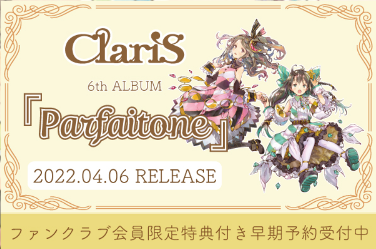 超次元音楽祭にてClariSの6thアルバムが発表されました🎉FC会員限定特典付きの早期予約(無くなり次第終了)の受付が始まっているのでまだ入会していない方はこの機会に入会してみてはいかがでしょう?https://ofc.claris-room.com/購入方法はFCサイトから商品ページに飛んで3種類のアルバムがあるので自分はとりあえず完全生産限定盤を予約しておきました。因みに予約対象期間は3/13㈰23:59までとなっております💦他のショップの特典も確認してから、もう一方の初回限定の購入を計画しております!まだ、ClariSを詳しく知らない方は「初回生産限定盤(2CD)」がお勧めです!DISC2にDJ和氏がMixしたClariS楽曲がノンストップで1時間以上で40曲楽しめる⚡先日は地上波で初の素顔でのパフォーマンスが話題になりましたが、今回のアルバムのプロモーションでも二人の魅力が確認出来るので以下のティザービデオも要チェックです🐴ClariS 6th Album『Parfaitone』(Teaser Video)https://www.youtube.com/watch?v=9DgSjUah8dsアルバムの中にツアーの先行予約案内が入ってますように🙏うま