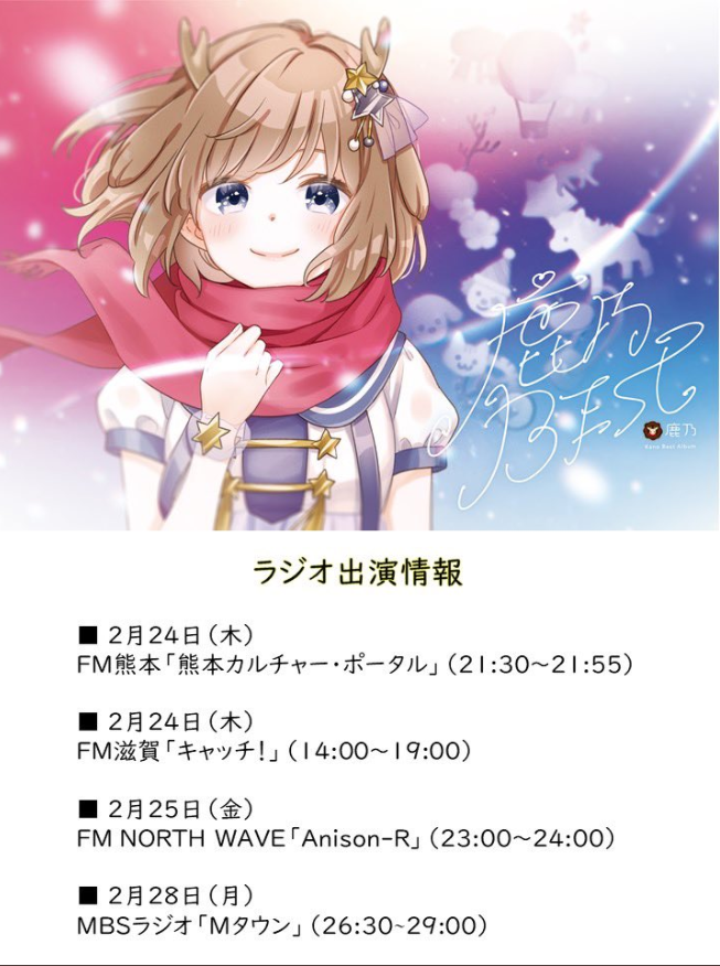 先日のねんどろいどの日記でも紹介しました鹿乃さんのBESTアルバム鹿乃BESTリリースが近くなってきました🦌そんな中・・・【楽天ブックス限定先着特典】鹿乃BEST(缶バッジ(57mm)) [ 鹿乃 ]価格:4400円(税込、送料無料) (2022/1/16時点)楽天で購入リリース記念ライブを開催するとの事です♪また、新規でグッズを発表されているのでそちらも要チェックです👀【1月29日(土)22:00~鹿乃BESTリリース記念ライブ~musica~を開催いたします!】https://kano-official.amebaownd.com/posts/30970027/当日は以下のリンクで視聴出来るとの事です。https://www.youtube.com/channel/UCShXNLMXCfstmWKH_q86B8w★全編無料配信となりますのでぜひご覧ください!★