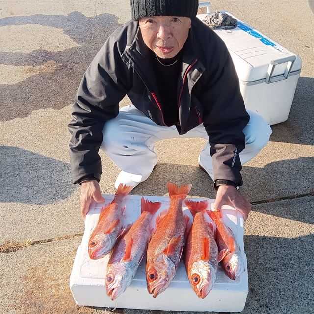 13日 小名浜港からの出船です。久しぶりの凪に恵まれて期待を胸にポイントへ約2時間程走ります。今日はYouTubeでもお馴染みのちいちゃんフイッシングのちいちゃんも乗ってます。釣り座は右舷のトモから二番目に俺 釣友の関戸さん三番ちいちゃんは俺と背中合わせの左舷です。水深200Mからスタート、暫く当たらず外道のサバ、目鯛が元気ですその中で最初に俺に本命がヒット、40センチ位の旨そうなやつをゲット出来ました。その後は外道の連続でアカムツに餌を喰わせる間が無い中2匹追加船長のご厚意で30分延長してくれました。そして本当の最後の流しで投入後すぐにアカムツのアタリを捉えて合わせを入れるとしっかりと針にかかったようです。重量感たっぷりで外れるなよと祈りながら巻き上げてくると途中途中で激しく叩きがありアカムツと確信、水面下に大きな魚体のアカムツが見えてきた延長してもらった甲斐が有りましたぁー下船後計ったら50センチジャストちいちゃんの釣ったアカムツと一緒に記念撮影釣果 アカムツ4 黒ムツ2 目鯛7 ユメカサゴ10 サバ多数外道が多くて苦戦しましたがお土産出来て楽しかったです。ブログ村に参加しています。応援よろしくお願いします。船釣りランキングをクリックして下さいね ↓ ↓ ↓ 船釣りランキング