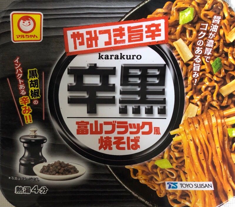 マルちゃんやみつき旨辛辛黒富山ブラック風焼そば(東洋水産)を頂きました♪ カップ焼きそば部活動70杯目 ・麺90gの標準サイズ ・かやくはメンマとネギ ・ソースは液体ソースとこなソース ・麺はお湯を入れて4分タイプ ・麺はもちもちでコシがあり美味しい ・塩味が若干強いのが残念、ギリギリ許せるレベル ・胡椒が凄まじい! ・15位/70品 ・胡椒が好きな人にオススメ♪ 東洋水産 マルちゃんやみつき旨辛辛黒富山ブラック風焼そば 115g×12個【1個あたり129円】☆2ケースまで送料1配送分☆ 発売日:2019年4月22日