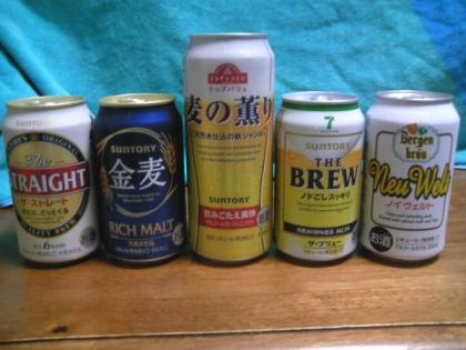 最近、100円ビールとかで話題のPB(プライベート・ブランド)の「第3のビール」を集めてみました。今回から数回にわけてテイスティング・レポートを書いてみようと思います。まずは、ラインナップのご紹介!右から、 1)ダイエーの「バーゲンブロー ノイヴェルト」・・・350ml=79円(期間限定価格) (老舗的低価格ビール。通常は89円) 2)セブン&アイの「ザ・ブリュー ノドごしスッキリ」・・・350ml=123円 (単品はセブンイレブンで、6缶パック=600円(100円/缶)は、イトーヨーカドーで販売) 3)イオンの「トップバリュー 麦の薫り」・・・350ml=100円/500ml=145円 (さすがに売れているのか350ml缶は入手できず) 以下は、NB(ナショナル・ブランド)の代表。 4)サントリー「金麦」・・・350ml=120円(※SEIYU調べ) 5)サントリー「ザ・ストレイト」・・・350ml=120円(※SEIYU調べ)今回は、PBのビールとしては老舗的な、ダイエーの「バーゲンブルー ノイヴェルト」をティスティング・レポートをしてみたいと思います。この商品は、2007年3月より通常販売しているので、知っている方も多いのではないでしょうか。発売当初より89円と低価格で販売しているので、いまさら「100円ビール」なんてと思うところですが、期間限定で79円に値下げしたところを見ると、ダイエーも相当あせってますね。そのお味はというと、軽めでスッキリとした味わいです。後味がさわやかなので、ビールの苦手な人もいけるのではないでしょうか。これがビールと言って出されたら、私なら騙されてしまうでしょう。さて、次回は100円ビールの味に迫ります。 今日の楽しさランクは、「イヒヒ」