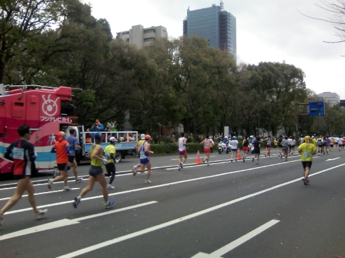 今日は、休日出勤。奇しくも「東京マラソン2009」の日会社のすぐ近くがコースになっているので少し抜け出して見に行ってきたちょうど向こう側に、先頭集団が折り返して戻ってきたところ風の強い小雨交じりの日だったけどとにかくみんな頑張ってました。写真には写ってないけど、アフロヘアーや面白い帽子をかぶって走っている人の姿もありました。今日の楽しさランクは、「プププ」