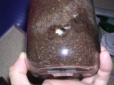 みなさんお久です。常温飼育の私にはやっと虫を語れる季節になってきました。原点に返って今日は菌糸詰めについて最近の私のやり方をブログにしてみました。まず、用具を全てエタノール殺菌します。自分の手ももちろんエタノールで消毒です。菌糸を扱う場合、他の菌の混入を極力さけることが重要です。菌糸よりも他の菌の活動が活発な夏場の場合は、この作業を念入りにする必要があります。野外の冷所に保管していた菌糸ブロックです。暫く見ていないうちに菌糸が分厚く回っています。パン切りナイフで菌糸をそぎ落とします。こんな感じ♪結構白いところも残っていますが、気にしない気にしない♪d(^0^)b♪ブロックをゴミ袋に入れます。ゴミ袋の口をこんなフウに縛り、ブロックを袋の外から揉みほぐします。菌糸がカナリ回っていたので、培地が痩せてしまっています。約4%の添加剤を投入。袋を縛りなおしてさらに揉み解します。こんな感じに仕上がりました♪今度はビンを用意。もちろんエタノールで殺菌します。ビンに投入して棒で詰めます。この時期の3令幼虫用のビンは、体重を乗せて固めに詰めます。詰めている棒は子供が小さい頃使っていた積み木です^-^詰め終わったら、箸を用意します。これで5箇所ほど穴を開けます。菌糸が活動する上では空気が必要なので、固めに詰めた場合には多めに穴を開けます。こんな感じに仕上がります。900ビンが4つ出来ました。特撮フィギアだ!!↑皆さ~ん。ワンクリックお願いしま~す。(^-^)/ 下位ですが、がんばりま~す。