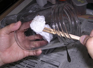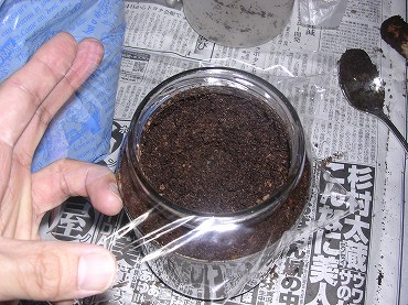 ウチにはフタの無いビンが幾つかあって。。。^^;そんな場合皆さんはどうしてます~^^自分はサランラップをつかっています。まあどうでも良い工夫ですが、簡単なので紹介しましょ(^o^)/まずはサランラップをぴったりとビンの口に張ります。。。次に輪ゴムで止めます。。。そして真中をカッターで十字に切り、四片を裏に折り返して、四角形の穴を開けます。四角に切ったキッチンタウパーを穴に当て、四辺にセロテープを張って出来上がり~^^これで3~4ヶ月持ちますよ~次の交換までフタを開けない菌糸ビンでの使用がベストです。ここで、雑学を一席。。。皆さんはサランラップという商品名の由来をご存知ですか。私はムカシ旭○成の子会社に居たので直接聞いたのですが、(以前どこかのテレビで紹介されました^^;)アメリカのダウケミカル社では軍事用に開発した樹脂フィルムの拡販について頭を悩ませていました。あるとき、社員家族がピクニックに行ったのですが、奥様方がこの樹脂フィルムを使ってサンドイッチを包んで行ったのです。これが評判となって「食品保存用ラップ」が誕生しました。旭○成では、この奥様方「サラ」と「アン」の名前をとって「サラァンラップ」という名前で商品化しました。これがサランラップの名前の由来で~~す。もしかしたら伝言ゲームみたいにチョット話が違ってきているかもしれませんが^^;だいたいコンナ話でございました♪d(^0^)b♪ビッダーズ昆虫オークション最近フリマでは生き虫の出品が禁止となりました。でも昆虫グッズはチェックの価値あり!楽天昆虫グッズ販売ページへ~(^-^)/ビッダーズの昆虫用品を主に集めました!!ビッデスト昆虫の餌最近の一番人気を表示していますd(^0^)bこちらもチェックを欠かせない!楽天特撮フィギア販売ページです(o^-’)b ****************************************************************************先日のアンケートをしばらく掲示します。第2弾!!アンケート作成及び投票はコチラクワカブなんでもアンケート!!第1弾!!アンケート菌糸ビン何使ってる?****************************************************************************