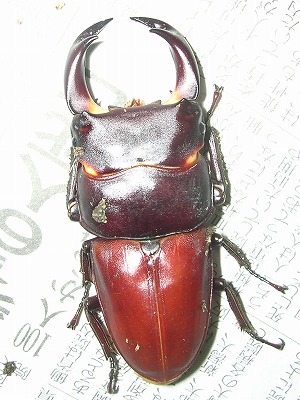 たらこ唇さんのブログで不明ドルクスの羽化個体の同定をやってるんですが、なかなか面白い特徴がでています。私はタイワンオオだと思うのですが。。。これほど湾曲したオオアゴで、しかも内歯が前を向いているのはタイワンオオか かなりマイナーなホーペしか見たことがありません。グランディスも湾曲していますが、内歯が内側を向いています。そして、ホーぺの代表的な特徴であるお尻のスボまりがほとんどなく、オオアゴ基部のクの字の切り替えしが全く無い事から。。。タイワンオオであるという見解を持つのが自然だと考えます。タイワンオオほどオオアゴの形の多様なクワは居ません。中にはホーペと区別が付かないヤツもいます。だからホーペっぽい特徴が出てしまってたら分からなかったと思います。タイワンは兄弟でもオオアゴの形や前胸背板の形がGタイプCタイプと出ますので、ブリードしてみて、その出現をもって判断すると確実ですね。たらこ唇さん、がんばってブリードしてみてください。↓これはウチのタイワンです。ビッダーズ昆虫オークション最近フリマでは生き虫の出品が禁止となりました。でも昆虫グッズはチェックの価値あり!楽天昆虫グッズ販売ページへ~(^-^)/ビッダーズの昆虫用品を主に集めました!!ビッデスト昆虫の餌最近の一番人気を表示していますd(^0^)bこちらもチェックを欠かせない!楽天特撮フィギア販売ページです(o^-’)b ****************************************************************************先日のアンケートをしばらく掲示します。第2弾!!アンケート作成及び投票はコチラクワカブなんでもアンケート!!第1弾!!アンケート菌糸ビン何使ってますぅ?****************************************************************************