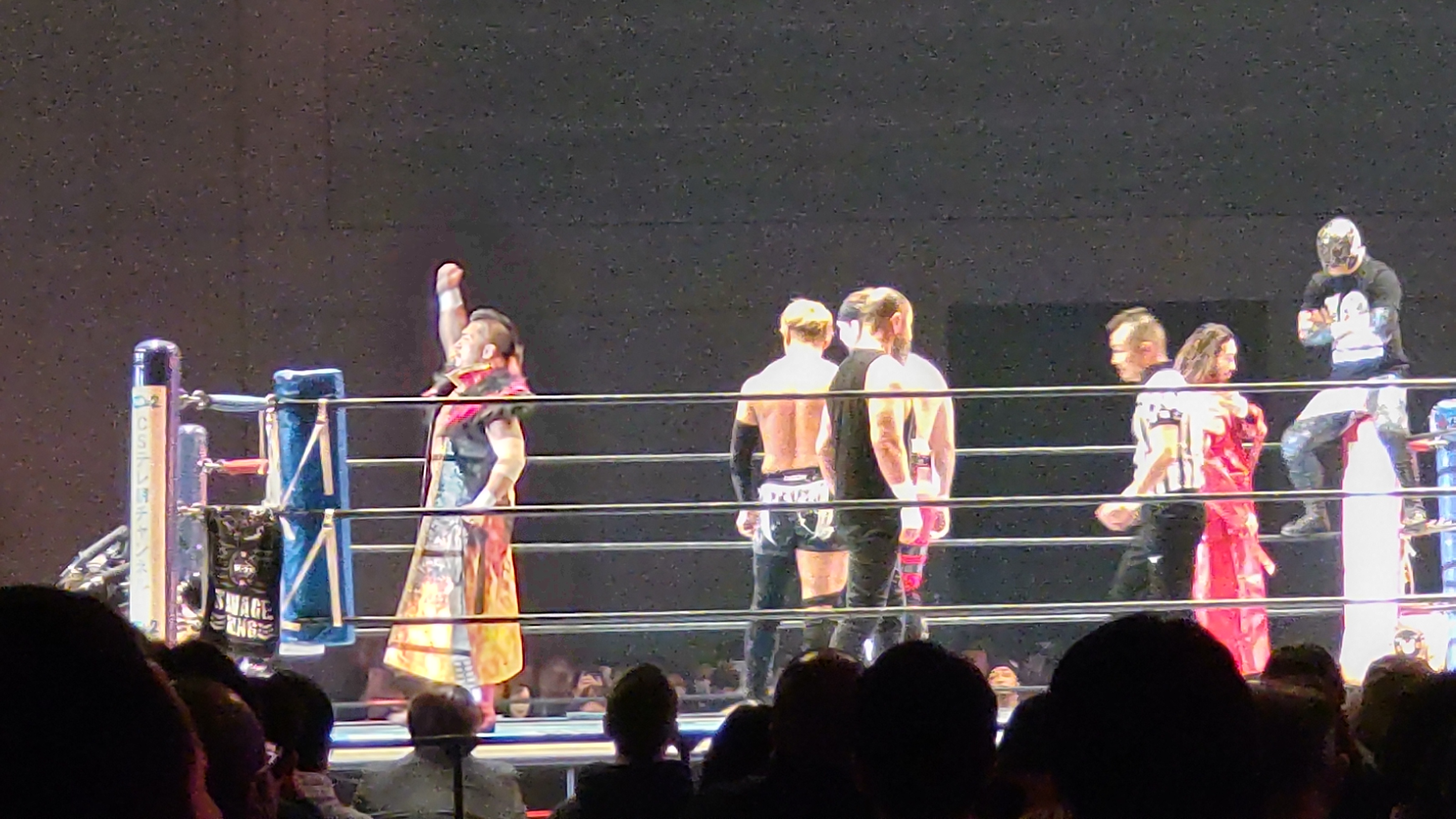 本日、当地で新日本プロレスがあった。プロレスが大好きで、毎週2本の番組を録画して見ている。生で見るのは、数十年ぶりであり、早めに出かけたつもりだったが、既にグッヅ販売やサイン会は長蛇の列で、プロレスの人気に驚いた。当日券を手に入れ、試合が始まる時間まで、車の中で本を読んで待った。席に行くと、二番目の高価な入場券なのに、リングから20mほども離れている。 ※内藤哲也、高橋ヒロム、鷹木信悟・・・などが写っています。離れているので、リングの上は見えるが、リング下の乱闘は見れない。プロレスは、リングサイドで見るのが一番迫力があるようだ。