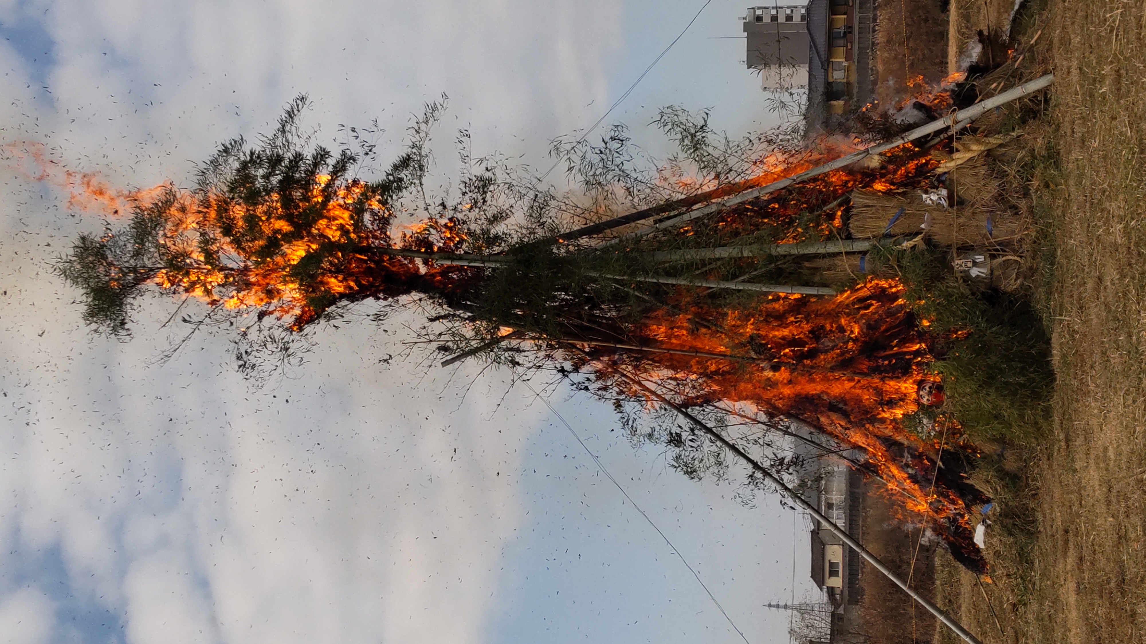 今日1月13日、「どんどや」をした。3年前から、自治協議会がこの行事を復活させ、今回が3回目。2日前に、藁をベースに竹を組み上げたが、竹が生なので、その重たいことこの上なし。老体にムチ打つも、手に負えず、若者の剛力に頼るのみ。そして本番の今日、200人弱ほどの人が正月飾りや餅などを持ち寄った。 生竹が破裂する大きな音が、気持ちよく胸に響いた。 火が落ち着くと、針金に結んだアルミホイルで包んだ餅を投げ入れ、子供たちが焼き餅を作っていた。準備から後片付けまで、大変な労力でした。