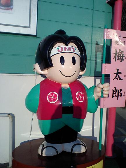 あけましておめでとうございます前回更新後、仕事にかまけるうちにすっかりブログから遠ざかってしまいました。その間も、訪問していただいた方々、ありがとうございます今年もブログを続けるつもりですので、よろしくお願いします。さて、皆さんは今年の抱負などお決まりでしょうか?私は毎年、何か新しい事を始めることにしています。昨年は、このブログで、2年前が株取引、3年前が外貨取引、その前はなんだろう?・・・キャンプもその1つで5・6年前の事でした・・・気になる流行事に乗ってみるといったところでしょうか。今年はまだはっきりとは決めかねているのですが、気になる事柄と言えば昨年、GoogleがYou Tubeを買収したニュースと今年のニュースである、フセイン処刑映像流出である。なので動画投稿にチャレンジしてみるか~と思ったりもしてるのですがどんなもんでしょう~話はガラッと変わりますが、昨年末、予定通り白浜温泉に行ってきました残念ながら、前回紹介した“紀州レンジャー”のショップに立ち寄ることは出来ませんでした。しかし和歌山にはまだキャラがいました楽天でもショップを展開されているおいしい梅干しの梅翁園阪和自動車道みなべICを降りてR42を白浜と逆方向へ少し進むと梅翁園さんがあります。そこでは、工場見学や3Dシアターを楽しむことが出来、もちろん商品を購入する事もできます。その、入り口で出迎えてくれるのが“梅太郎”かなり“そのまま”なキャラです。キャラの出来はともかく、梅干の出来はとてもいいので是非お試しください。お勧めは、梅うらら あかね 角タル 1.3kg程よい口当たりで梅の自然な甘みが感じられます。近くに行くことがある方は是非立ち寄ってみてください。この工場併設ショップにしかない、かなりお得なつぶれ梅がありますのでお忘れなく!もちろん“梅太郎”もね