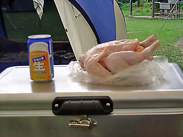 今日は昨日の続きでキャンプでのアウトドア料理を紹介します今回はどんな料理を楽しもうかと思ったのですがワイルドにチキンを丸焼きにしてみました材料はチキン丸ごととビールが1本チキンは前日に外と内に塩コショウをして冷凍したものです。プルトップを開けたビールをチキンに差込それを炭火のグリルにドーン家庭のキッチンではお目にかかれない見事なワイルドさこれを3時間ぐらい置くと中のビールが染み込んで出来上がり!見た目はイマイチで“失敗したかな~”と思ったのですが食べてみると、と~~てもおいしいそのお味をたとえるなら、真鯛の塩焼きの味でも1羽丸ごとはさすがに多かったので余ったチキンは翌日にチキンカレーにしてみました。そしてこれを“カレーライス”ではなく“ナンカレー”で食べようと“ナン”を炭火で焼いて作ってみました。ナンはとても良い感じで焼き上がりとても美味しかったですアウトドア料理はやっぱり楽しいですね~テキトーにやっちゃうんで失敗する事もありますがそれもまた良い思い出になります。みなさんも機会があれば“チキン丸焼き”チャレンジしてみてください