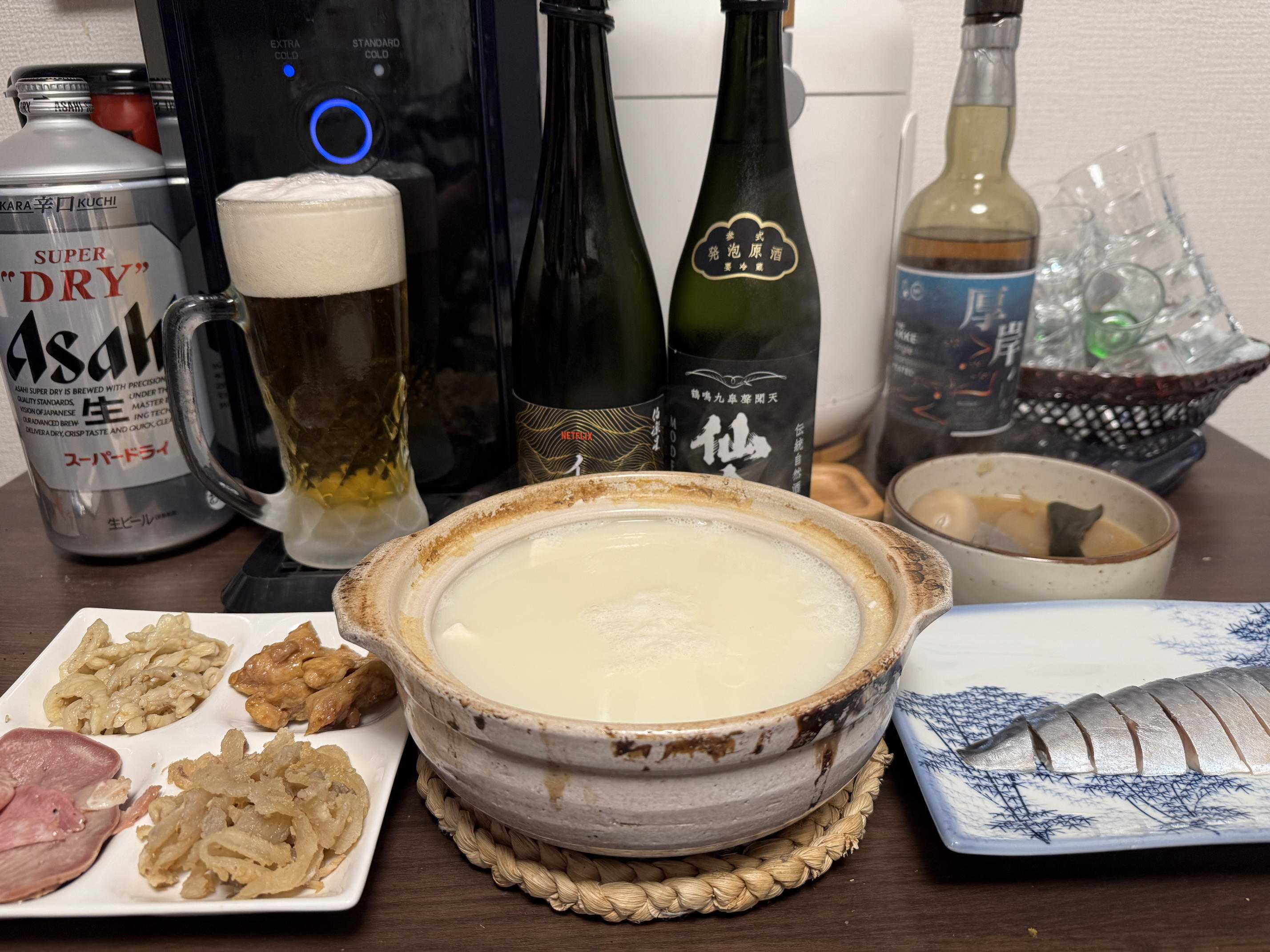 昨日はウィスキーでしたので、今日は軽く日本酒です。温泉湯豆腐・しめ鯖・お…
