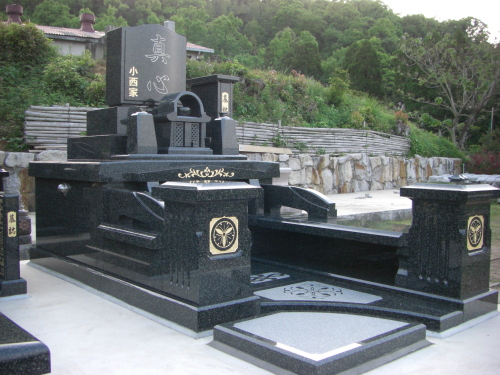 今後の世界経済は、いったいどうなって行くのだろう?上天草市松島町は、海運業の町と称されるほど海運業の盛んな町で、様々な用途の船が日本中の港を航海しているが、最近は親会社から契約を切られたり運賃の大幅カットがあり最近では、松島港に繋がれたままの大型船までいる。 上天草市(松島)の経済は、海運業をはじめ観光施設や宿泊施設の動きが止まれば、自ずと、我々の仕事にも影響を及ぼすこととなる。 今年に入って、我が家の仕事も減りこざこざ(と言っては失礼だが)の仕事ばかりで、【私たち、そしてどうなるの~】って感じだったが昨年から取り掛かっていた区画に、昨日全ての作品が完成した。新規墓石完成区画全体の風景