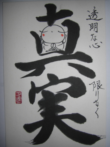自分の人生の中で最も大切にしている言葉と文字は、 【真実(しんじつ)】 楽天ブログのお気に入りとして登録しコメントも頂いているゆうみアート書さんhttp://plaza.rakuten.co.jp/nanairoangel/ から先日、素晴らしい贈り物を頂いた。 綺麗な貝殻に描かれたお地蔵さんの絵と「ありがとう」の文字4cm大のそら豆みたいな石質の素材に描かれたお地蔵さんと「今日も心に幸せを」と書かれた作品に1cm×2cm大の小さな石ころみたいな素材に描かれた可愛い天使のようなお地蔵様の絵の裏に「歓びの種」と書かれた作品を頂いた。そして、自分が希望した【真実】の書も頂いた。ゆうみアート書さんから頂いた作品 裏面には、 どこまでも 強く どこまでも やさしい 真実の心 とても綺麗な毛筆で、そう書き込まれていた。そして、同封されていた手紙の文字も素晴らしかった。 “タダで頂く”なんて・・・ダメダメ何かお返しをしなければと悩んでいる。 ゆうみアート書さん、本当にありがとうございました。
