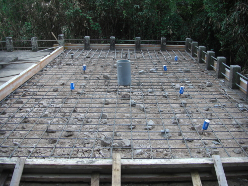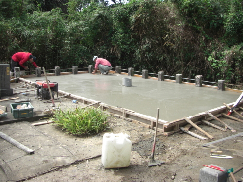 昨日から6人で取り組んでいるお墓のリフォーム工事 作業内容は、既存の黒御影石の碑部と墓誌玉垣、灯篭、香炉、花立は再利用しそれ以外は全て解体し、石材は20cm角ほどに小割りし基礎コンクリートも全て解体し約12立米の土を掘り出し撤去した後小割りした石材と、コンクリートの塊を埋め込み地盤を硬く叩き詰めた上に鉄筋コンクリートの基礎を施工しその上に墓石を施工する内容。 昨日、全ての石材と基礎コンクリートを解体し、今日は、土の撤去作業と小割りした石材の埋め込み作業を行ったが9時半頃から台風の影響で、激しい雨が降ってきたしかし、寒くはないし、天候が良くても、どうせ汗まみれとなるし雨でも支障がない作業内容だったので従事した6人全員がパンツまでびしょ濡れになって頑張った。 午後からは雨も上がり、曇り空の中で作業を継続したが一気に6人で頑張ったので、生コン打設準備まで終えることが出来た。基礎生コン打設準備OK この画像の地下50cmには、解体した石材やコンクリーとの塊を埋め込み、更に2立米の砕石を入れ込んでランマーで叩いて、突き詰めています。そして、コンクリートで見えなくなってしまう中には、今日の画像で確認出来ると思いますが、13mmの鉄筋を200mmピッチで配筋しています。(今回の13mm鉄筋の使用量は、6m長を50本) 明日は、5立米の生コン打設作業となるが天候次第では、中止するかも? 明日天気になぁ~れ