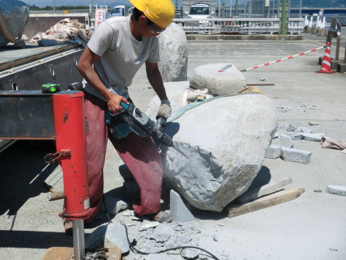 今日より大仕事の始まり!熊本市の熊本港に恵比寿像を建立するため基礎工に取り掛かった。施工場所全体の風景がコンクリート造りのため丸みのある自然石を使用することにしたが10トン車二台の自然石の数も重さも半端じゃない。早速今日は、その自然石を用いた階段造りから取り掛かったが割ったり、削ったりの繰り返し作業で精神的にも、肉体的にも疲れた。自然石加工風景 追記・・・・・・・・・・・・・・・・・・・ 大学時代の美術部仲間である同級生が今朝、癌が原因で亡くなった。いっしょによくスケッチに行った。共に騒いで呑んだ。ふたりで20日間の北海道YH巡りの旅行に行った。天草にも何度も来てくれた。・・・・・・・・・・・・・・・・・・・・・・・・・辛すぎる。 福岡市で行われる明後日の葬儀には何としてでも参列しようと思っている。