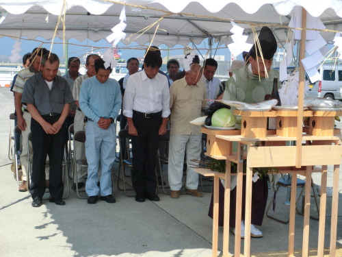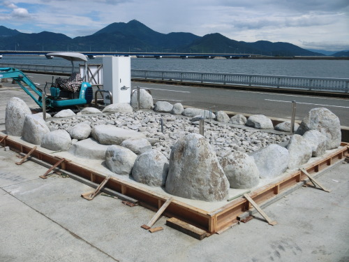 昨日は、熊本港での仕事が終わってからいったん天草まで帰宅して福岡市まで片道3時間車を走らせ友人の最後の顔を拝ませてもらい霊前で、最期の別れを告げ、1時半帰宅。 そして今日は昨日に引き続き炎天下の下熊本港での恵比寿像施工のための基礎工事で昨日までに終えた自然石の囲みに鉄筋の配筋と型枠設置とレベル出しまで終了し熊本県土木課(熊本港保安部)の審査を受けもちろん・・・全てクリャー審査をクリャーした基礎準備工