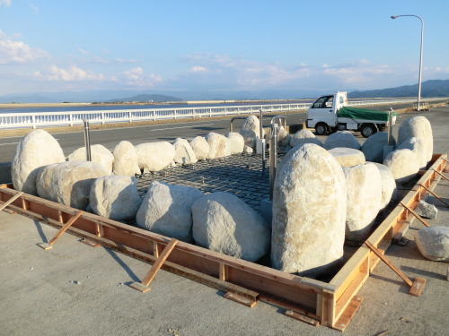 前々より自然石に近いかたちの丸みのある石材を石材採掘現場長に依頼していて昨日、「希望の原石がまとまった」と連絡を受け早速、十輪大型ダンプをチャーターして採石現場で石材を選び施工現場と自社工場に二台の石材を運搬した。石材を積み込む大型ダンプ・・・ということで今日より熊本新港に建立する恵比寿像施工作業がスタートした。今後色んな悩みや不安があるだろうけど安全第一で頑張ろうと思っている。
