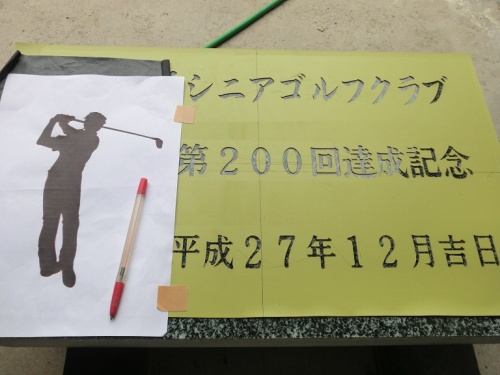昨年12月に第200回のゴルフコンペ開催を達成された上天草市内の〇〇〇シニアゴルフクラブのメンバーの方から【第200回達成記念】の記念碑制作を依頼されていてゴルフ場に15日(金)施工予定で制作に取り掛かった。文字彫刻準備 お世話役の方にワンポイントでデザイン彫りを勧め記念碑の一部に組み入れたところ、なかなかいい感じになった。ゴルフ経験のある人は、この影絵がどんなポーズなのか判るはずです。