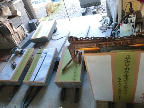 納骨式のお墓には一般的に墓誌(記名碑)が備わっていて一家の方に辛い御不幸があれば亡くなられた方の名前などを刻むが今年に入り、一気に七件の墓誌追加彫りの依頼があり昨日から三代目と二人であちこちの現場を駆け回っていて中には100kg近い墓誌もあり、痛めている膝と腰に負担がきている。 今日まで工場に搬入した墓誌は6本で急ぎの依頼もあるので、三代目と連携作業で文字彫り作業に集中搬入した墓誌の追加彫り作業 しかし、亡くなられた方の御家族に対し新聞掲載の【おくやみ】欄より、忌中にも関わらず手紙や家庭訪問など積極的な営業活動をしている同業者があるけどお客様の心境を無視した商売重視のタブーな行為だと思い今までこちらから亡くなられて直ぐの営業活動はやったことがない。 そう言えば、平成19年9月6日に父親が他界した後すぐにある石屋から電話があったことを思い出してしまった。「〇〇石材ですけど、お墓をつくりませんか?」だってぇ~ ふざけるな!要するに、相手がどんな心境なのかどころか何の仕事をしているのかも考えずに片っ端に営業を掛けてきている我が家の仕事は石屋だ!