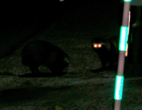 近年、田畑を耕作する人がめっきり少なくなり荒れ放題の野山にはイノシシが急激に増えがんばって耕作する人もイノシシの被害を受け「イノシシの餌を栽培しているようなもの」と嘆き、渋々ながら耕作を放棄する人が増え、益々野山は荒れ放題となりイノシシと共に夜な〃〃タヌキまで多く見るようになった。画像に収めようとしてもタイミングよく出てはくれないしドッグフードと残飯を部屋から10mほど離れた場所に置いたら待ってましたとばかりに二匹のタヌキがすぐに現れたので画像は悪いけど、その証拠写真をアップします。二匹のタヌキ現る捕食捕食後は、お礼も言わず美人に化身することもなく素通りで去って行った。バイバイ 10年ほど前までは、イノシシもタヌキもいなかったのに自然の生態系が大きく変わってきています。