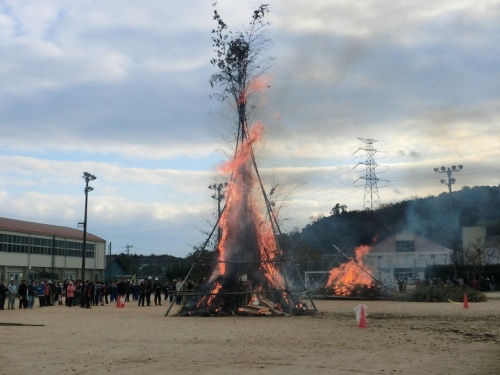 新年明けてから毎年行われる行事は3日の成人式と4日の消防出初式は確定していてその他に上天草市商工会の賀詞交歓会(8日)阿村地区どんどや大会(8日準備、9日本番)があり今年は、それに加え結婚式(3日)とお寺の法要(6日)まで加わって本格的な仕事始めは連休明けの12日からとなってしまう。 今日は阿村地区の学者融合事業の一環として【どんどや大会】があり阿村小中学校PTA・社会福祉協議会・地元消防団阿村地区公民館・区長会・老人会・婦人会などの協力で開催され孟宗竹で二つの櫓を組み、正月に飾られた門松などの正月飾りなどを燃やし無病息災などの祈願と共に新年の歳の神を送り、残り火で餅を焼いて食べた。20m程の高さの櫓正月の餅を焼く未就学の孫らも初参加 どうか、この一年が素晴らしい歳となりますように・・・。