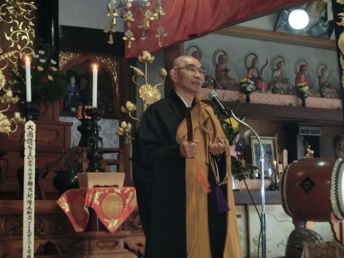 娘(次女)の嫁いだ旦那の実家(宇城市)を初めて訪問し昼間から温かい手料理のおもてなしを受けてご馳走になったが我が家の菩提寺である曹洞宗【大悲山向陽寺】住職の母親が昨日亡くなり急遽、今夜19時からお寺でお通夜が行われることとなったので地区総代を受けている自分も17時から受け付け担当の依頼があり初めて訪問した家庭で心行くまで酒を酌み交わすことが出来なかったけど昨年7月8日に誕生した五人目の孫の成長だけは確認できてよかった。五人目の孫(杏ちゃん) 産まれて半年、寝返りを打ってすくすく成長している様子を視れて大満足今度は、杏ちゃんの初節句祝いで改めて美味い酒を呑ませていただきます。 お寺では、17時に集まった総代を受け付けや駐車場誘導係りに配置され自分は、受け付け担当だったが、弔問者の多いことと僧侶の多さに唖然。僧侶の身内が亡くなれば、同じ宗派の僧侶が天草から「19時だよ全員集合」僧侶に対し、50人分の香典返しをしたけど、実数は何人か数え切れなかった。そして、多くの弔問客は寒さに震えながら境内に設置されたテントの下で南無釈迦牟尼仏×3・・・・・合掌・・・礼拝。お通夜の様子