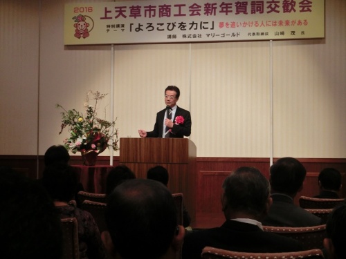 今年の上天草市商工会【賀詞交歓会】はHOTEL竜宮で開催され午前11時からの特別講演会は、上天草市大矢野町出身でブライダル事業展開で成功なさっていて二人の娘が結婚式でお世話になった株式会社マリーゴールドの代表取締役社長【山崎 茂】氏の特別講演で【よろこびを力に】という演題で講演があった。サブタイトルは「夢を追いかける人には未来がある」今の現実を真正面から捉え、明日を築いてゆくためのとても価値ある講演だったと思う。特別講演懇親会 【賀詞交歓会】は、今年も自分にとっては【名刺交換会】二次会・三次会と有意義な時間を過ごし、持参した名刺は全て交換してきた。