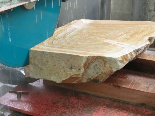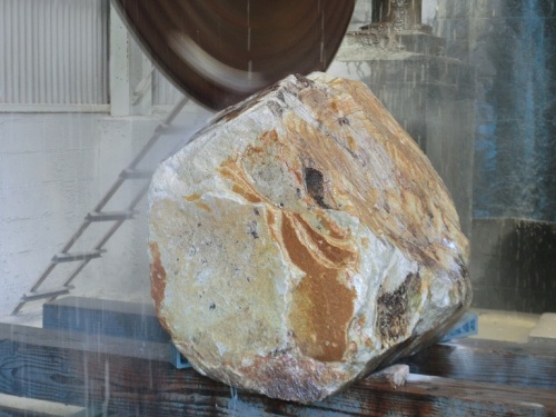 土曜日に72インチ大口径切削機で天草木目石を切削しその切削面の木目調の柄に大きな喜びと感動を覚えたが今度は32インチと22インチのオフカットで角材に切削したところまたまた最高の木目調の出現に感動してしまった。32インチオフカット切削22インチオフカット切削 何と6面(全切削面)に木目調の柄があって、最高の石が採れたこの角材に切削した石材がどのような作品に仕上げるか決まっていないけど最高の作品に仕上がることは間違いなし